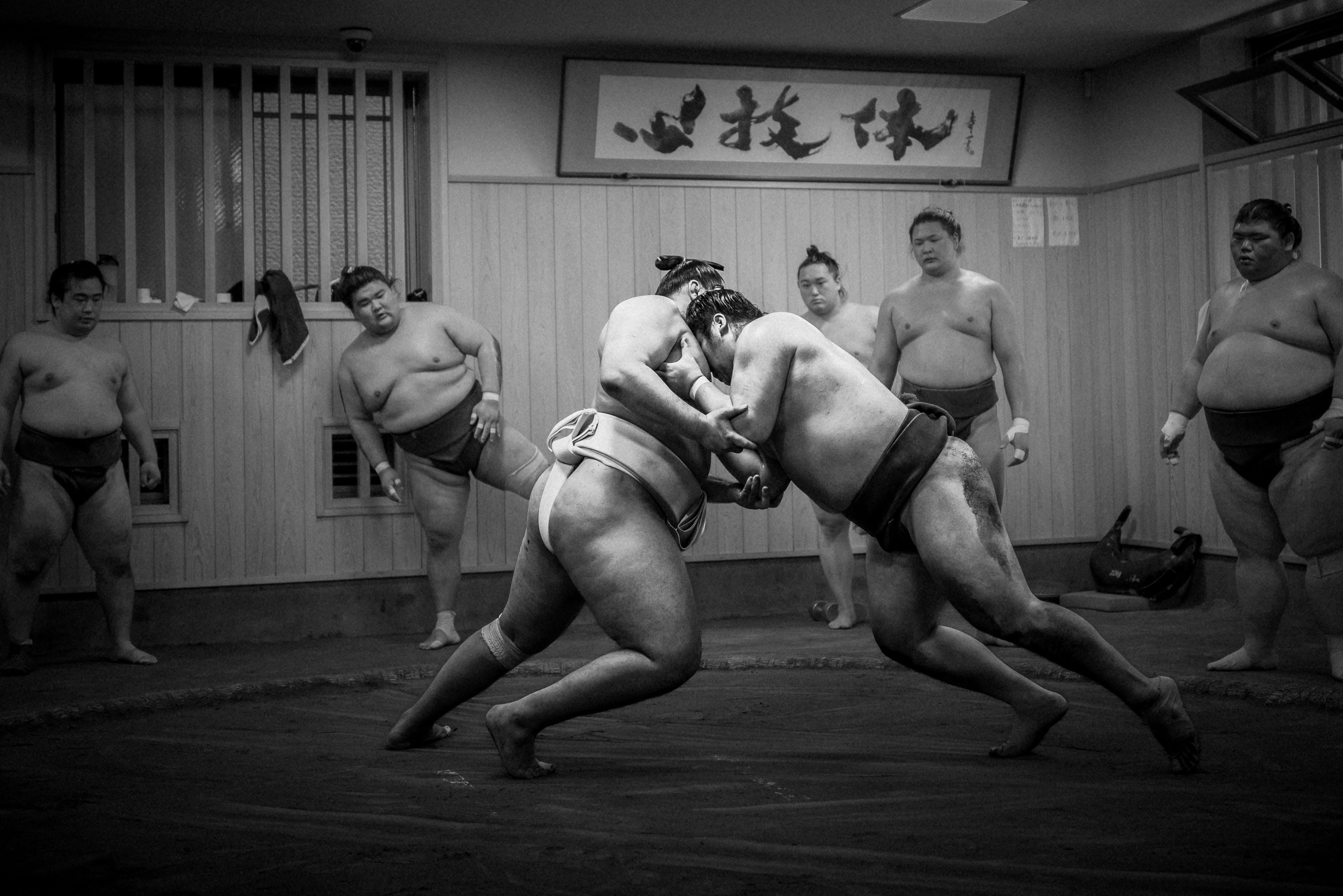 Veo la foto y los sumos se mueven, oigo los suspiros de los luchadores, algunas veces del cansancio, otras veces buscando las respuestas a las tres preguntas. Creo que en algún momento de nuestras vidas todos somos sumos, enclaustrados en algún "establo", combatiendo una lucha, y nos hacemos esas mismas preguntas...