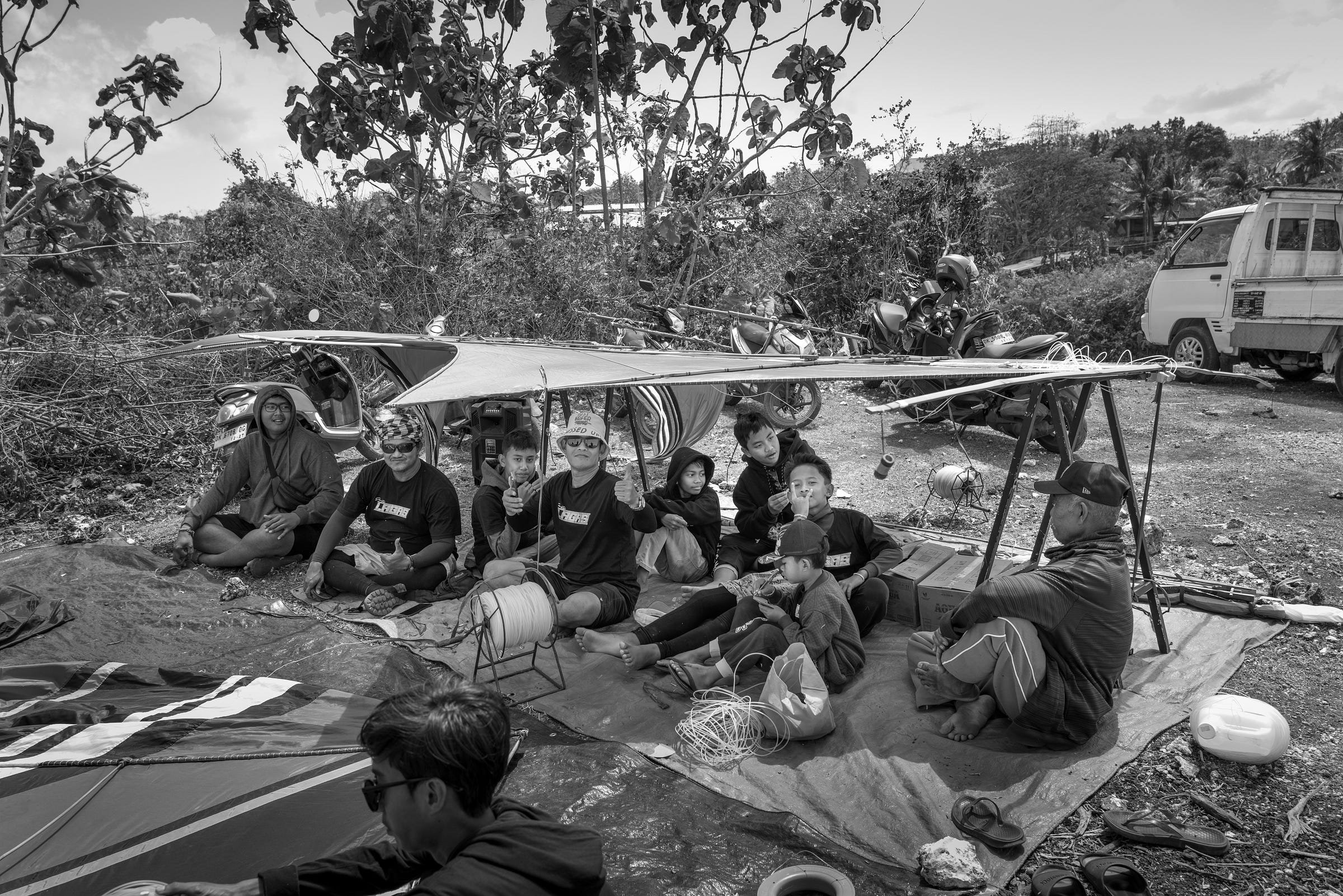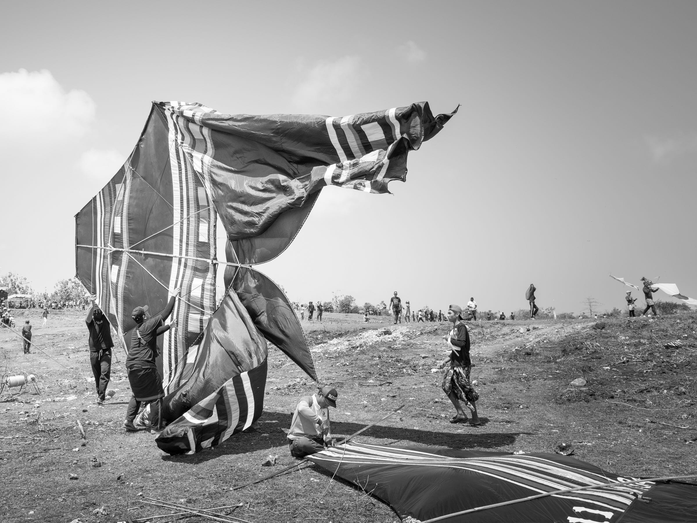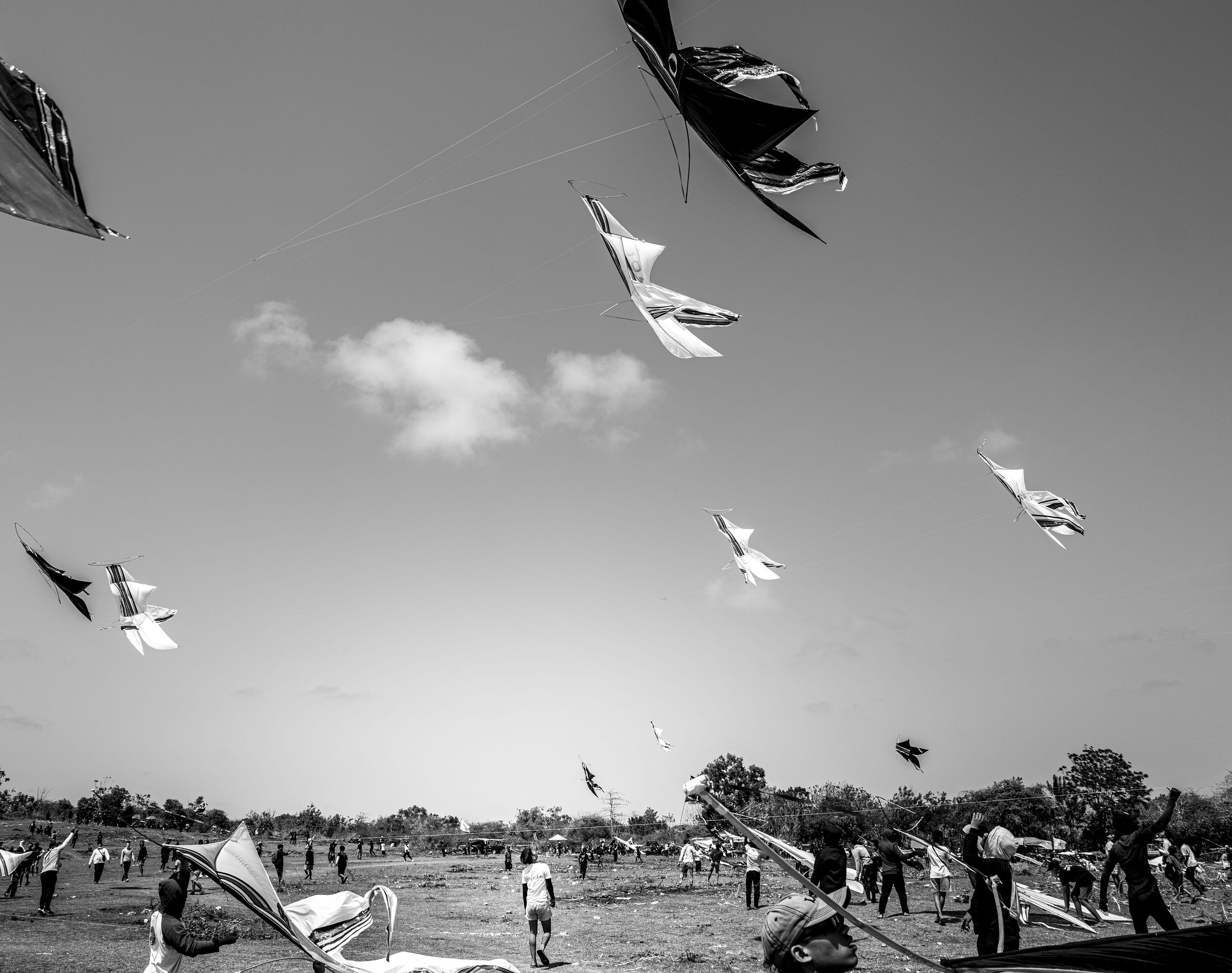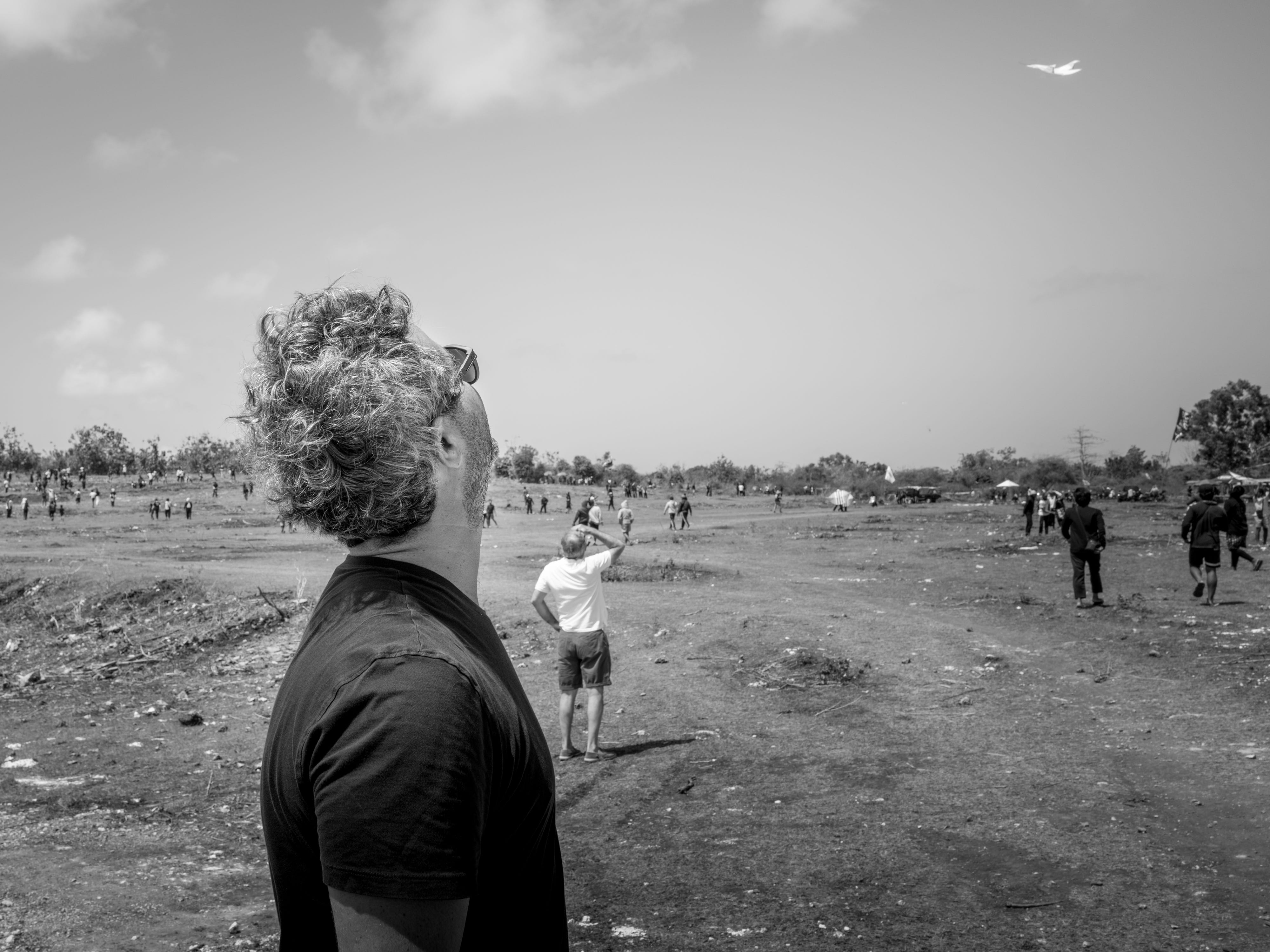 Daniel, José y yo estábamos saliendo a un brunch el domingo, cuando en el camino vemos que el festival de cometas de Bali estaba por comenzar. Aparcamos las motos rápidamente y en cuestión de segundos, había llegado el día y la hora, ¡dieron la orden de poner a volar todas las cometas! No nos creíamos la suerte de estar allí en ese preciso instante. La escena parecía de mentira. Un escampado repleto de gente lanzando sus cometas a volar. El sonido como de abejones en Sorround 5.1 nos hacía vibrar. Me llegué a emocionar. Nos separamos buscando distintas perspectivas. De vez en cuando nos cruzábamos miradas para compartir nuestro asombro y disfrute.
